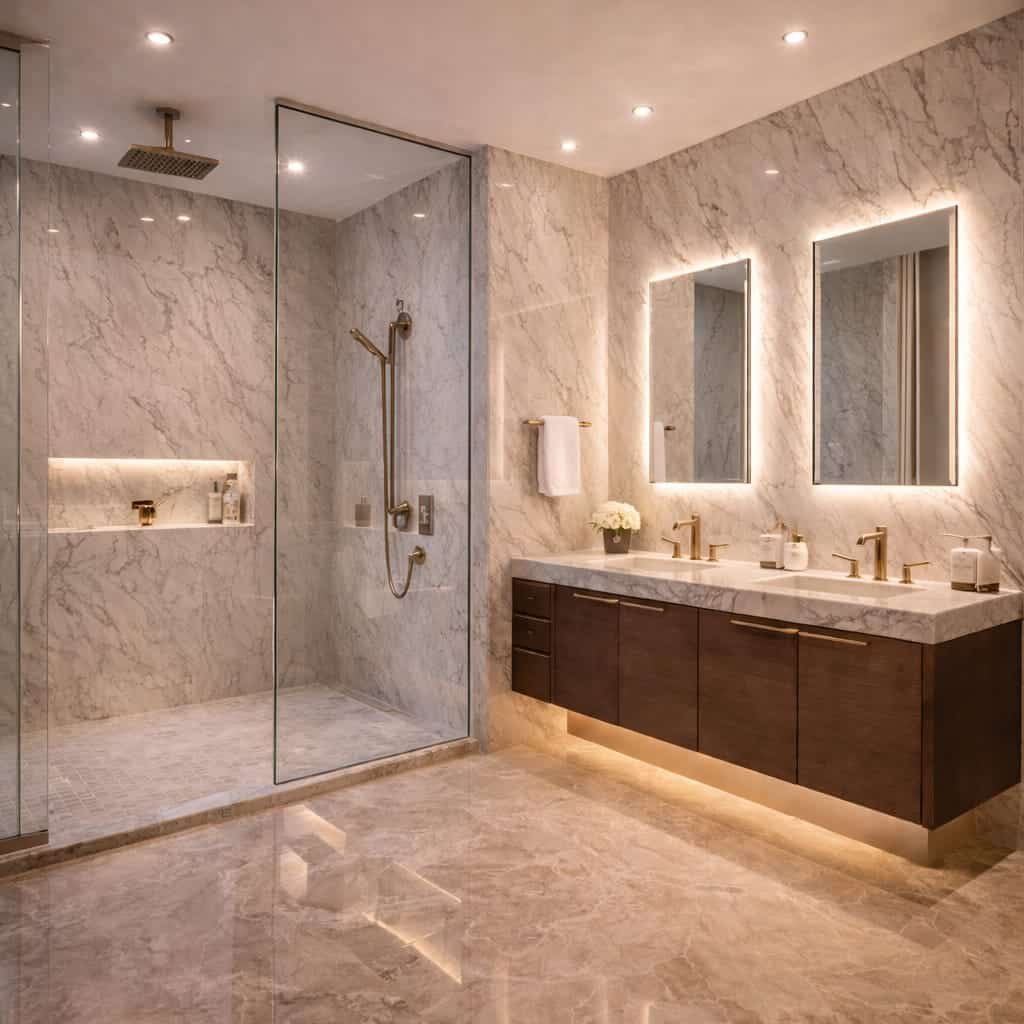 Luxury bathroom renovation in Downtown Dubai apartment with marble finish and modern lighting