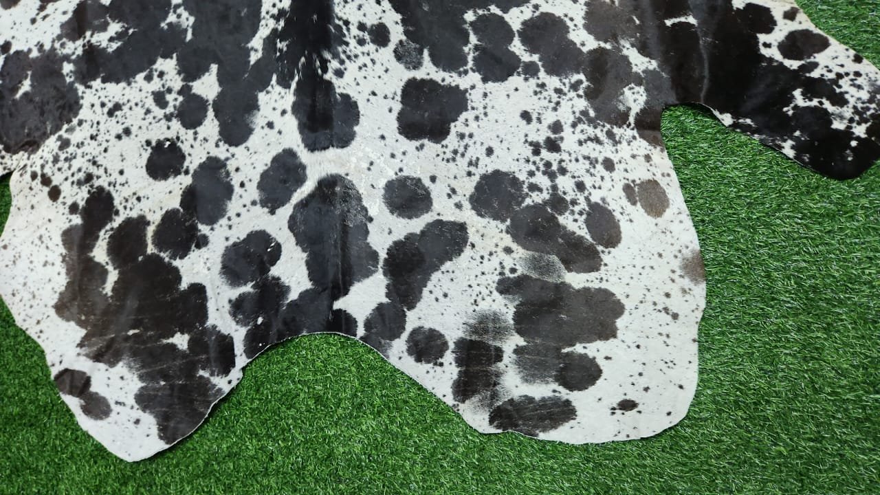 This oversized cowhide rug showcases a high-contrast black spotted pattern spread across a natural white background, with soft brown tones visible near the edges and within some spots. The pattern is organically distributed, creating a bold and eye-catching look while remaining elegant and natural.