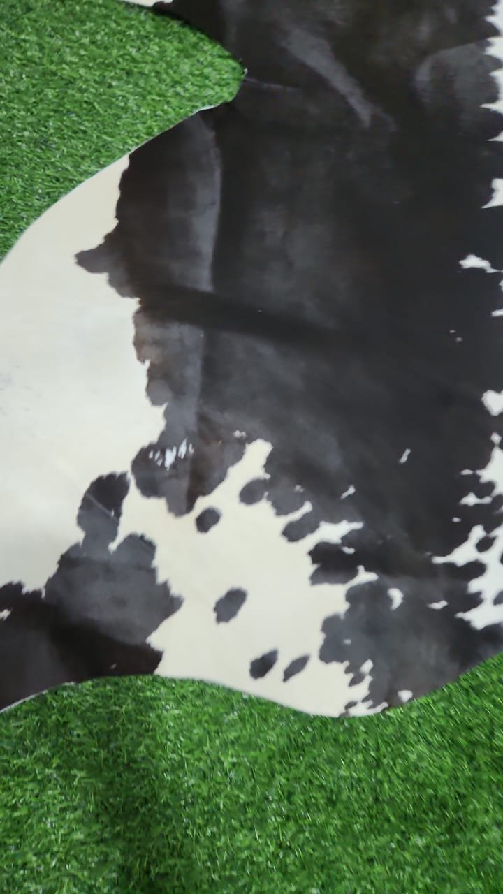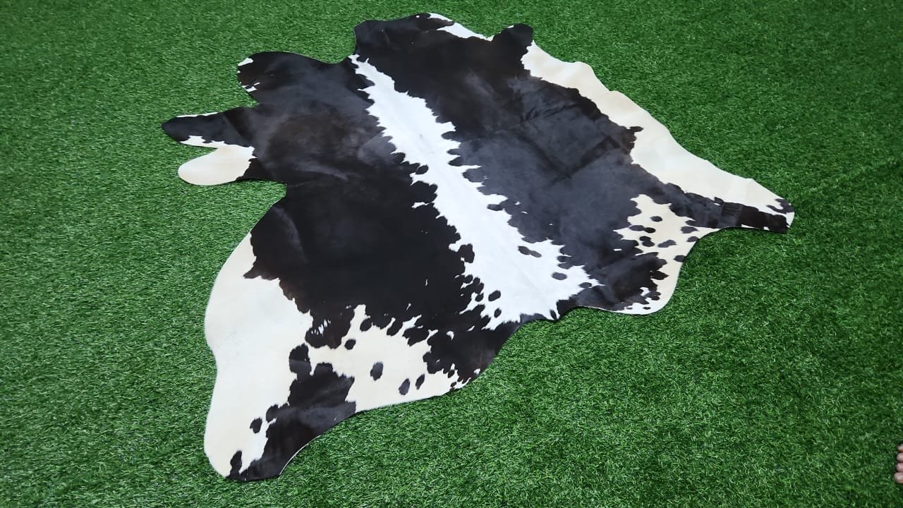 This authentic cowhide rug showcases a classic high-contrast black and white pattern, highlighted by a strong white stripe running along the natural spine. The black sections are rich and even, giving the rug a bold, modern look that works beautifully in contemporary and minimalist interiors.