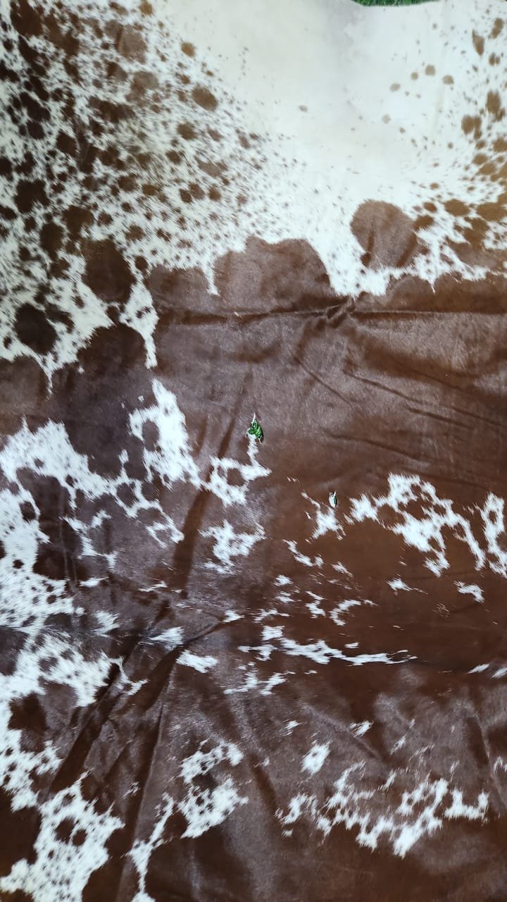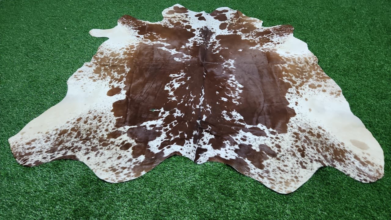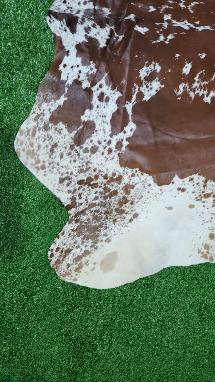 This beautiful cowhide rug showcases a warm brown dominant center, naturally divided by a white spine line, with organic brown-and-white speckling that spreads toward the edges. The pattern is bold yet balanced, making it a striking statement piece for modern and classic interiors alike.