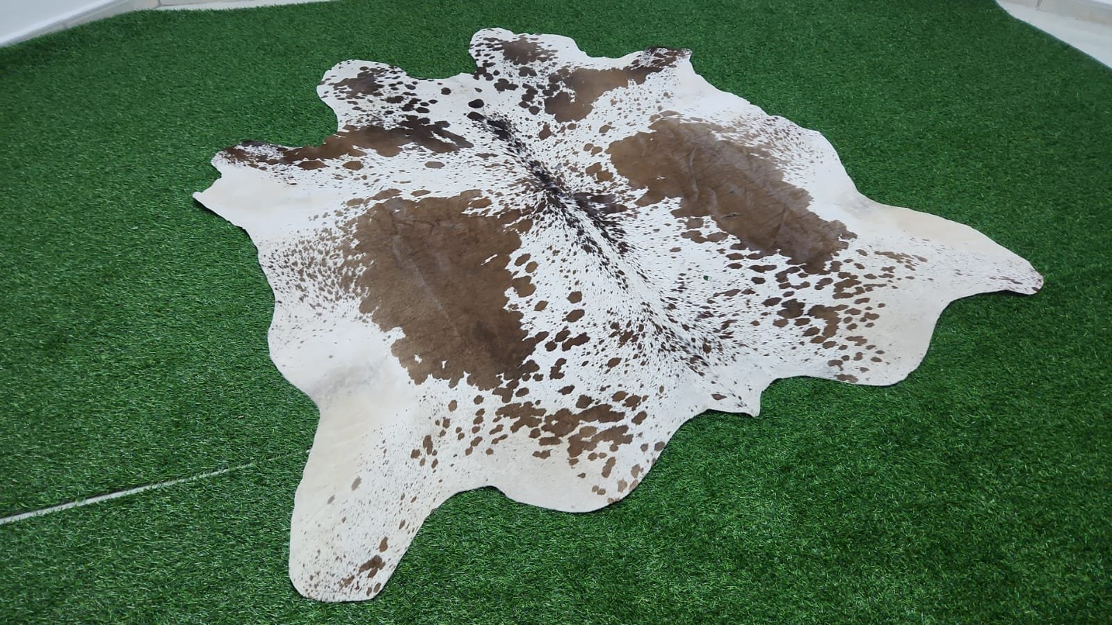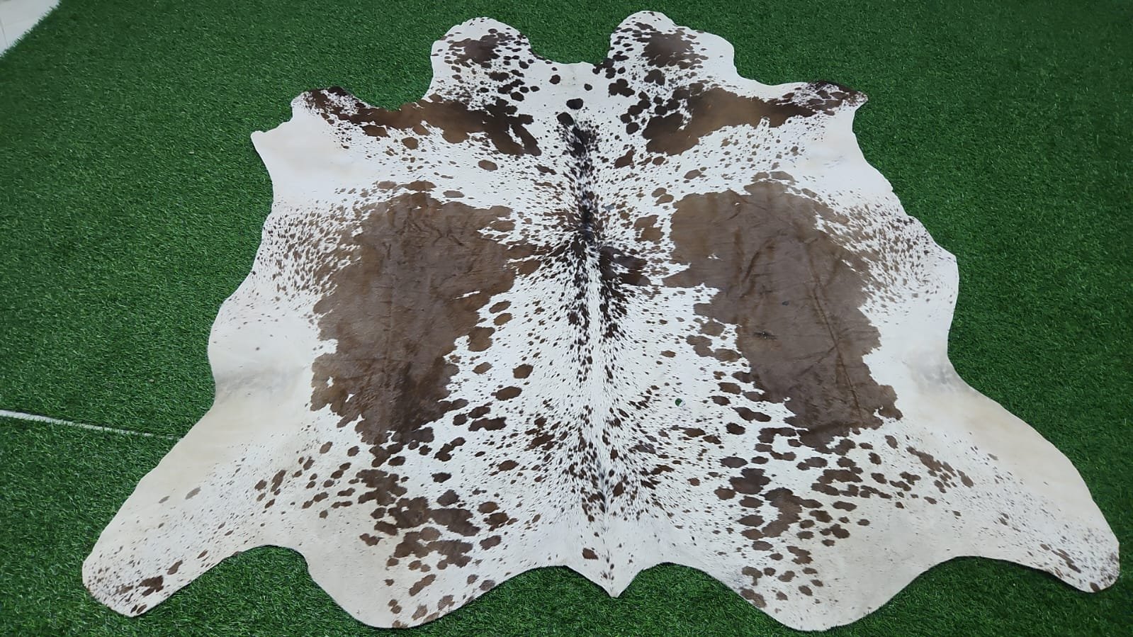 This large statement cowhide rug showcases a beautiful blend of white, warm brown, and dark speckled tones, forming a naturally balanced and eye-catching pattern. The central spine line enhances symmetry while keeping the organic character intact.
