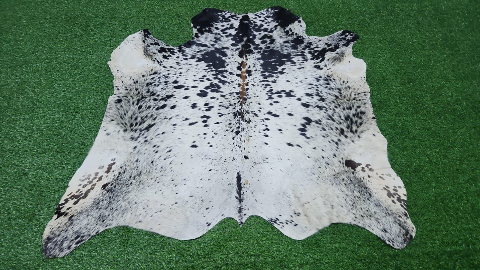 This large statement cowhide rug showcases a beautiful blend of white, warm brown, and dark speckled tones, forming a naturally balanced and eye-catching pattern. The central spine line enhances symmetry while keeping the organic character intact.