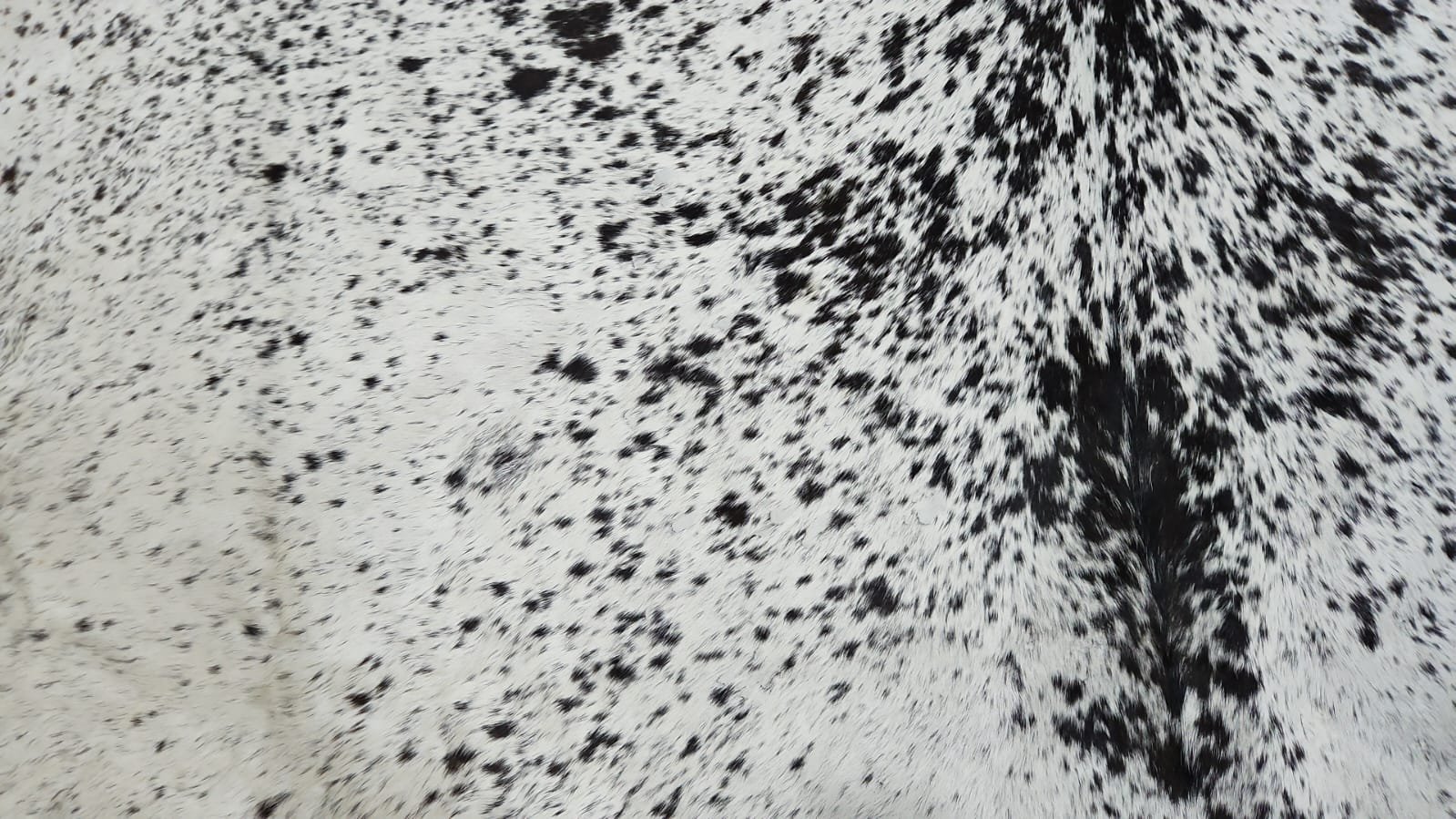 Bring a touch of natural elegance to your home with this beautiful, one-of-a-kind authentic cowhide rug. This hide features a bright white background with heavy black speckling throughout, and a beautiful dark line running down the center, giving it a dramatic and luxurious look.