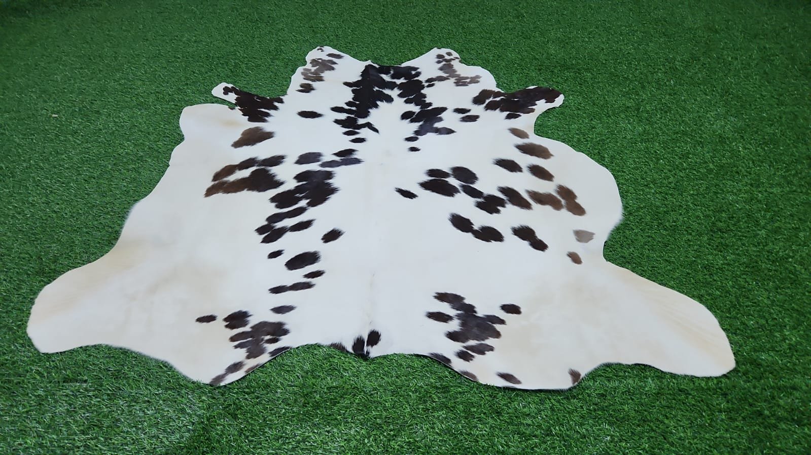 Natural White Cowhide Rug with Black & Brown Spots – 133×142 cm