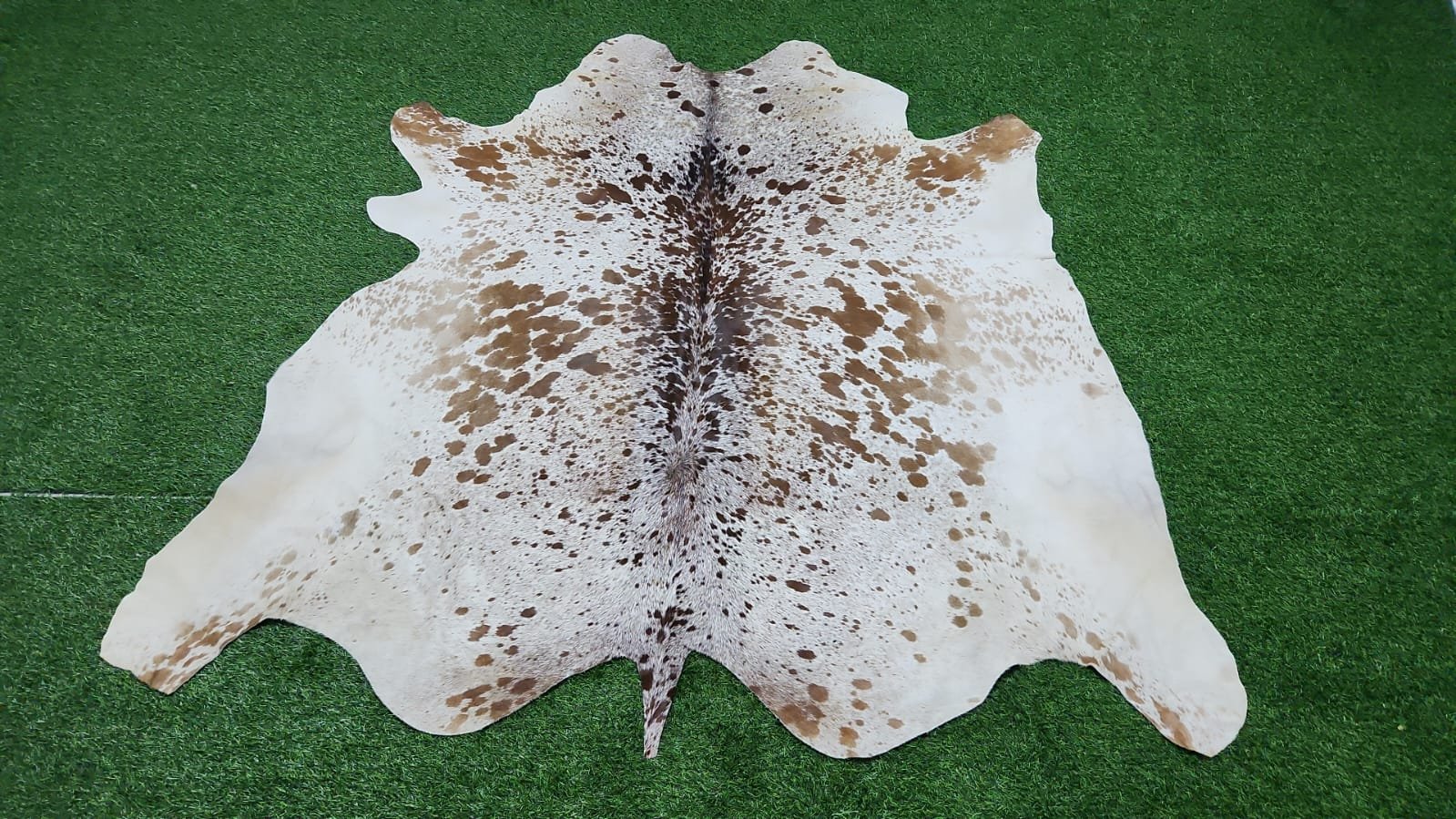 The hide features a creamy white background enriched with organic brown speckles and a pronounced darker spine line, making each piece truly one of a kind.