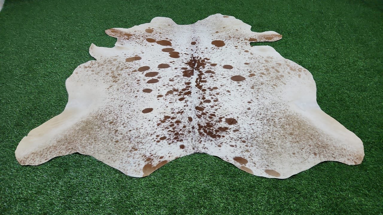 This beautiful cowhide rug showcases a light natural white background enhanced with warm brown spots and fine speckling, concentrated along the spine and organically fading toward the edges. The pattern is well-balanced and elegant, offering a soft, natural look suitable for both modern and rustic interiors.